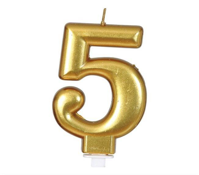 Świeczka urodzinowa w kształcie cyfry 5.