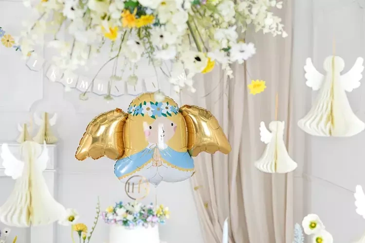 W kolorze złoto-niebieskim ozdobiony wzorami w kwiaty.