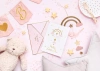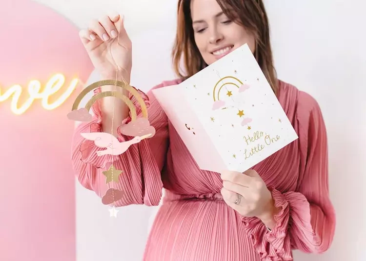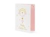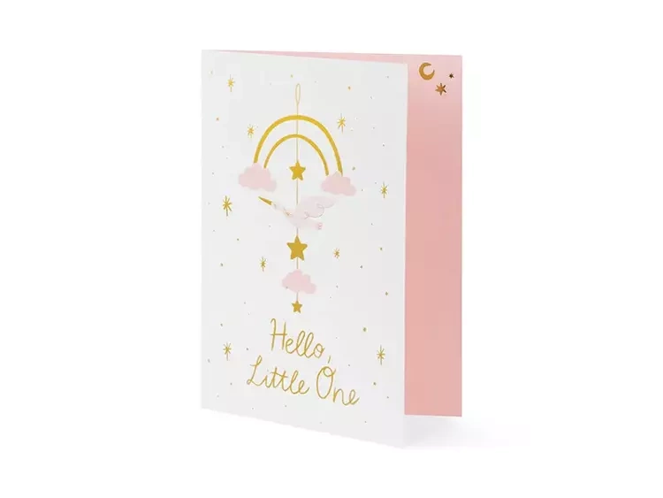 Kartka z zawieszką Bocian w kolorze różowym i złotym.