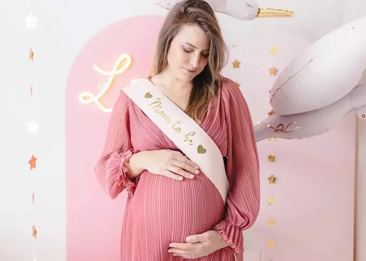 Szarfa ozdobiona złotym napisem "Mom to be" z serduszkami.