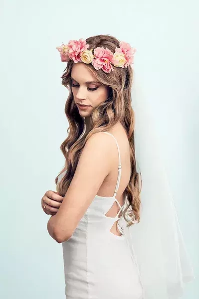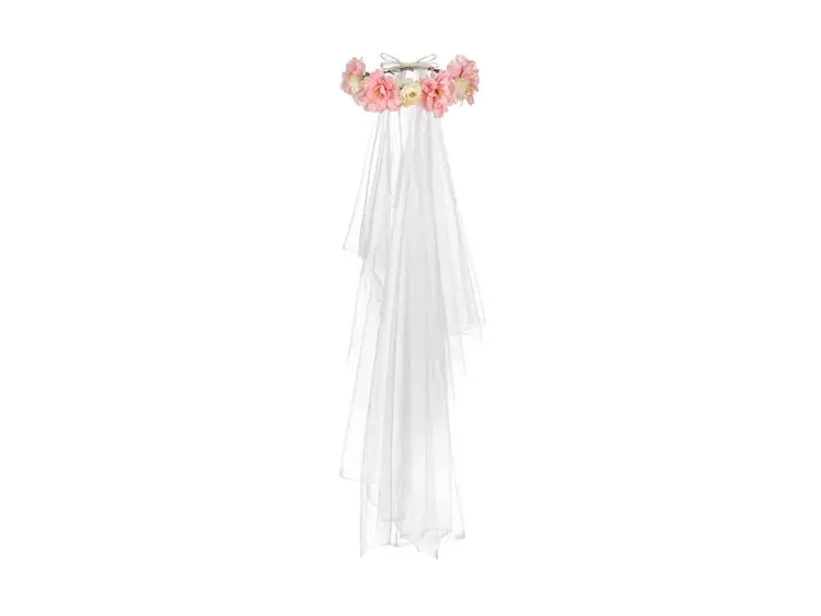 Wianek z kwiatkami i białym welonem.